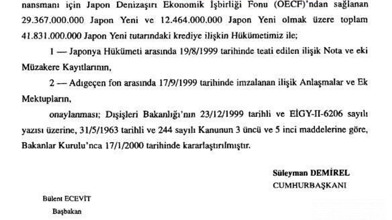 Resmî Gazete arşivlerinde yer alan bilgiye göre, 15 Şubat 2000 tarihinde Türkiye ile Japonya arasında “İstanbul Boğazı Demiryolu Tüp Geçit Projesi” kapsamında finansman ve mühendislik anlaşması imzalandı. Bu anlaşma, Ecevit liderliğindeki DSP-MHP-ANAP koalisyon hükümeti döneminde yürürlüğe girdi.