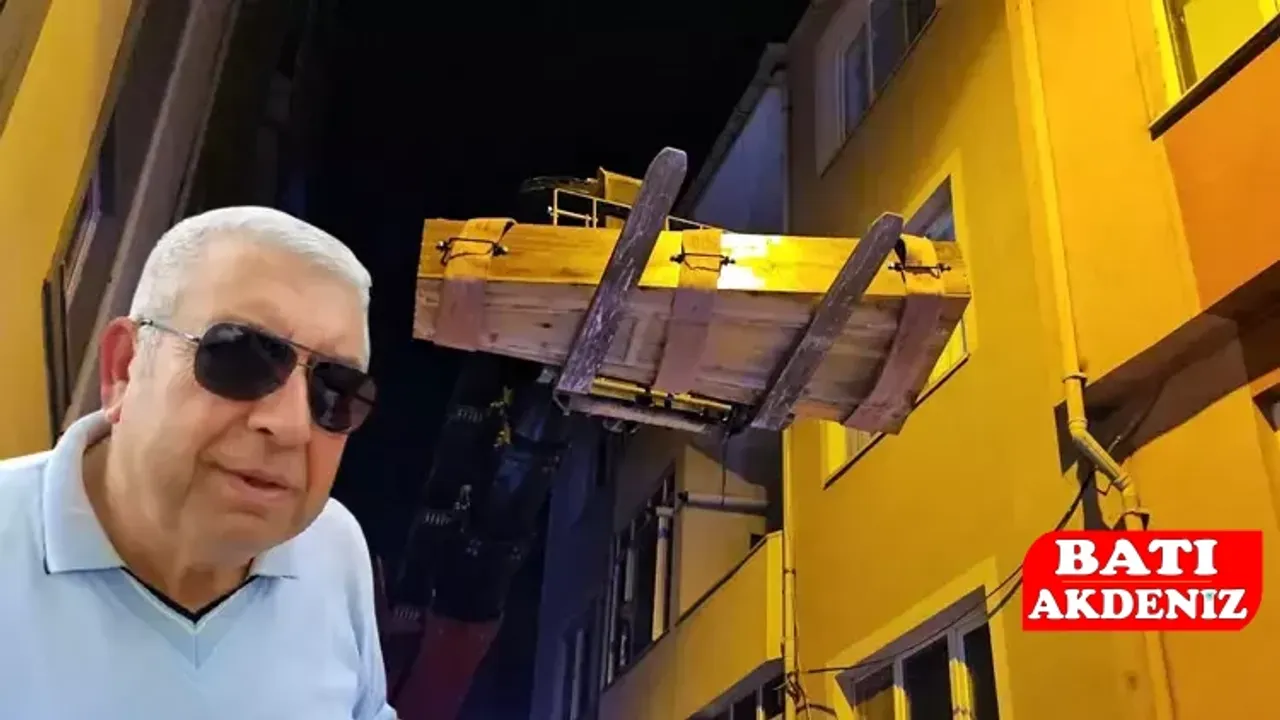 Tabut önce çatıya taşındı, ardından vinçle aşağıya indirilerek cenaze nakil aracına teslim edildi.