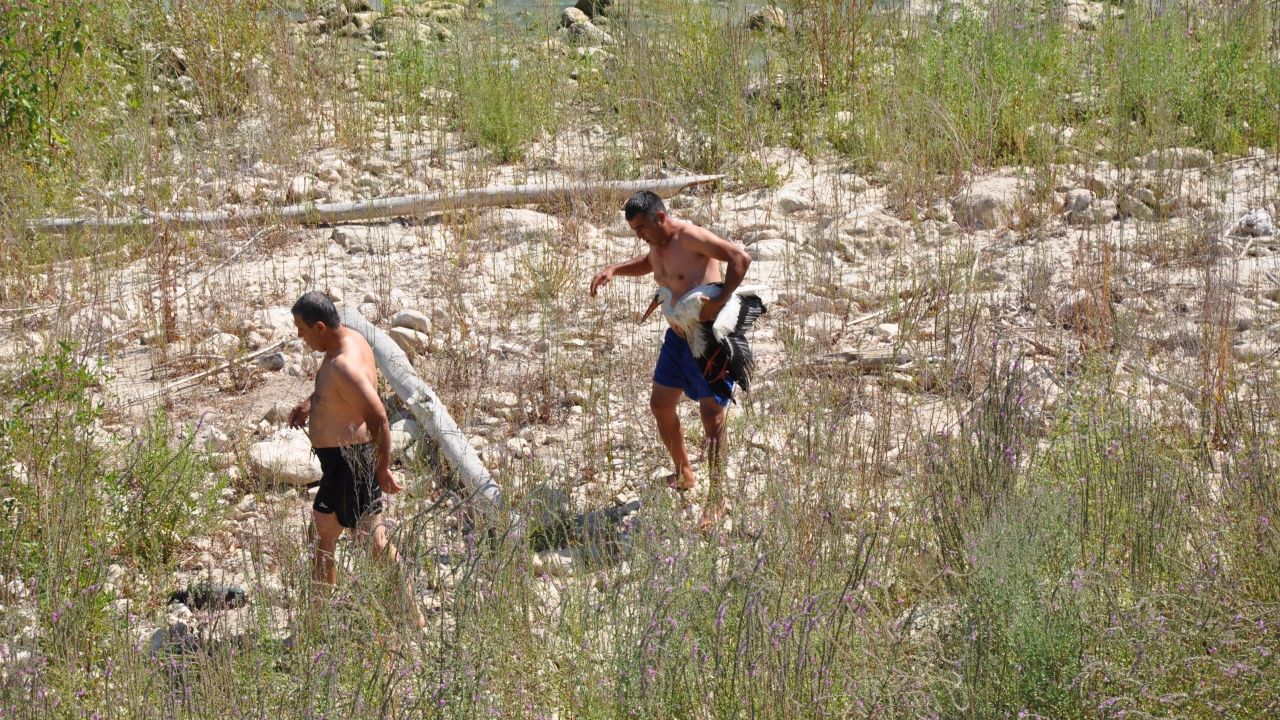 MERSİN (AA) - Mersin'in Silifke ilçesinde, kanadındaki kırık nedeniyle Göksu Nehri'ndeki adada mahsur kalan leylek, itfaiye ekiplerinin çalışmasıyla çıkarıldı.
