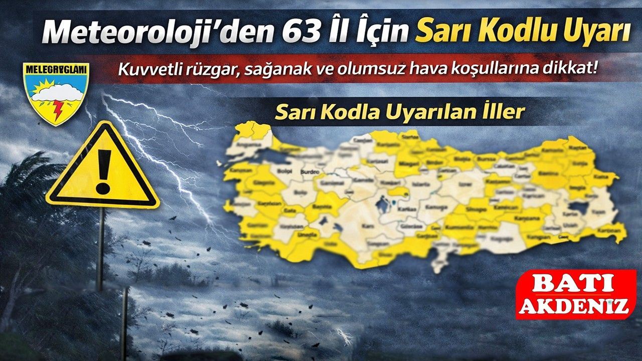 Meteoroloji Genel Müdürlüğü (MGM), yurt genelini etkisi altına alması beklenen olumsuz hava koşulları nedeniyle 63 il için sarı kodlu meteorolojik uyarı yayımladı. Yapılan değerlendirmelere göre birçok bölgede kuvvetli rüzgâr, yer yer sağanak yağış ve fırtına bekleniyor.