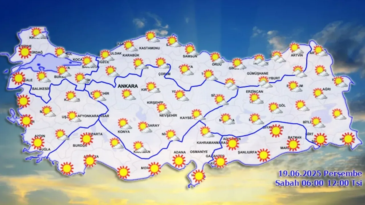 ANKARA (İGFA) - Meteoroloji Genel Müdürlüğü 19 Haziran Perşembe gününe ilişkin hava tahmin raporunu yayımladı. Buna göre ülkemizin kuzeydoğu kesimlerinin parçalı, yer yer çok bulutlu; Trabzon ve Rize’nin iç kesimlerinin yerel olmak üzere sağanak yağışlı, diğer yerlerin az bulutlu ve açık geçeceği tahmin edildi.