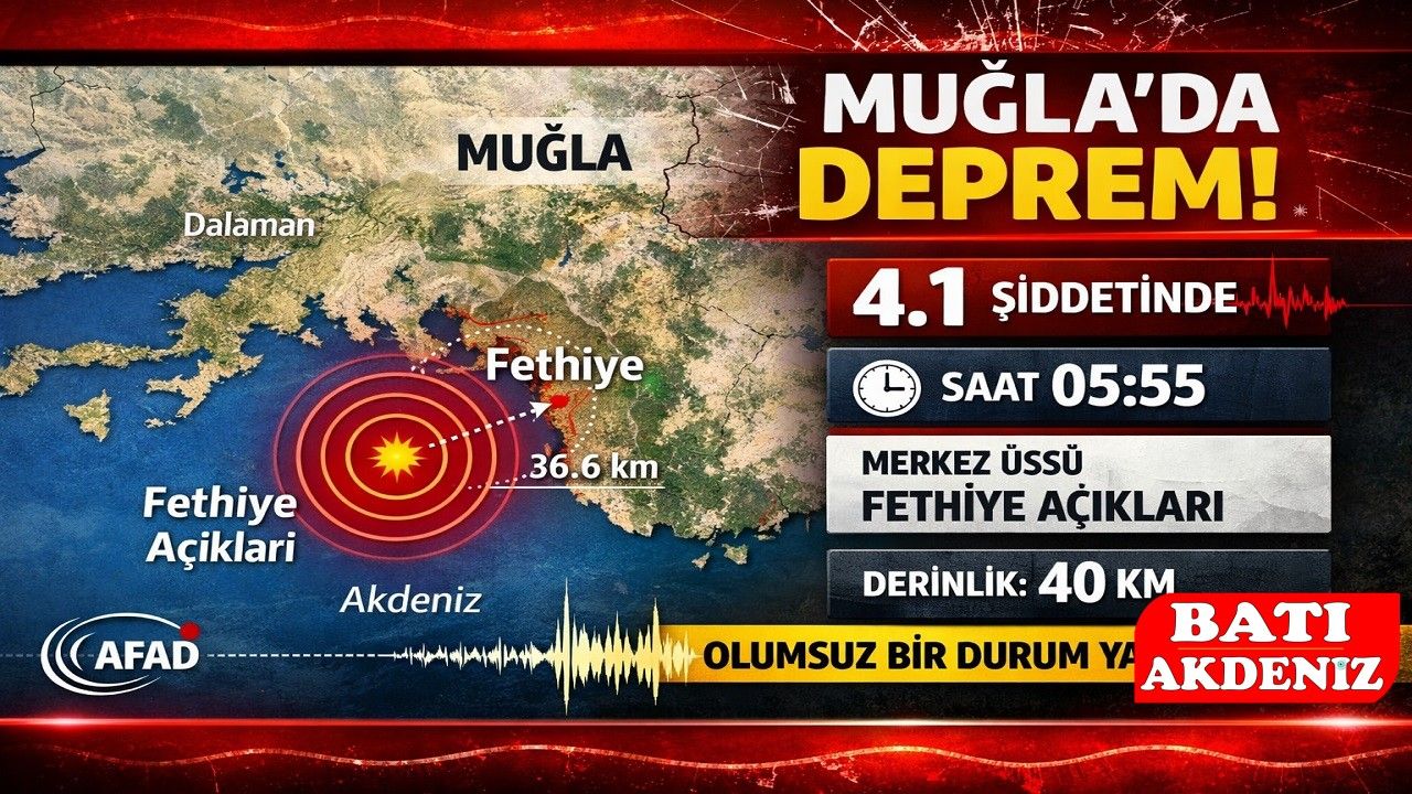 Muğla’da sabah saatlerinde deprem meydana geldi. Afet ve Acil Durum Yönetimi Başkanlığı (AFAD) verilerine göre, saat 05.55’te merkez üssü Fethiye açıkları olan 4.1 büyüklüğünde bir deprem kaydedildi. Yerin yaklaşık 40 kilometre derinliğinde meydana gelen sarsıntı, Fethiye başta olmak üzere çevre ilçelerde de hissedildi.