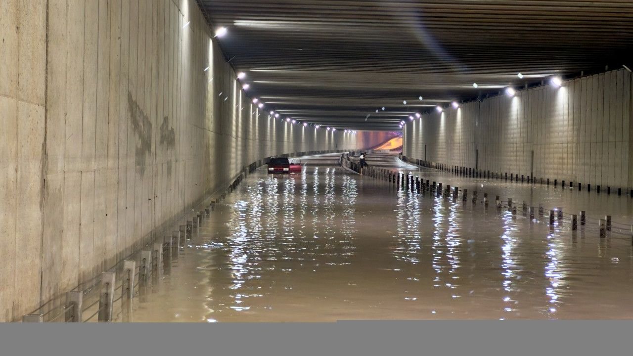 Bazı araçlar altgeçitte biriken suda mahsur kalırken, itfaiye ekipleri tıkanan mazgalları açmak için çalışmalarını sürdürüyor.