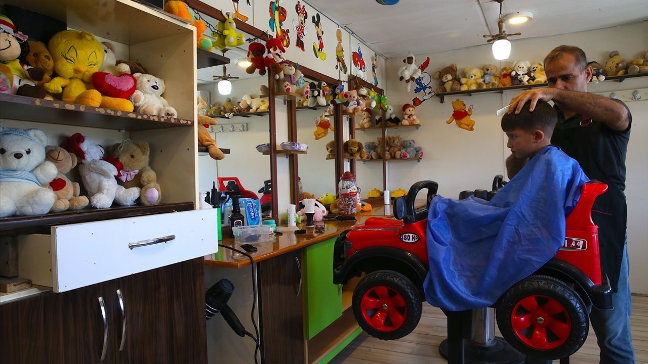 Türk Kızılayın maddi destekte bulunduğu berber, çocuk müşterilerinin yüzünü güldürmek için araba şeklinde tıraş koltukları yerleştirdiği işletmesini, çizgi film karakterlerinin resimleri ve oyuncaklarla süsledi.