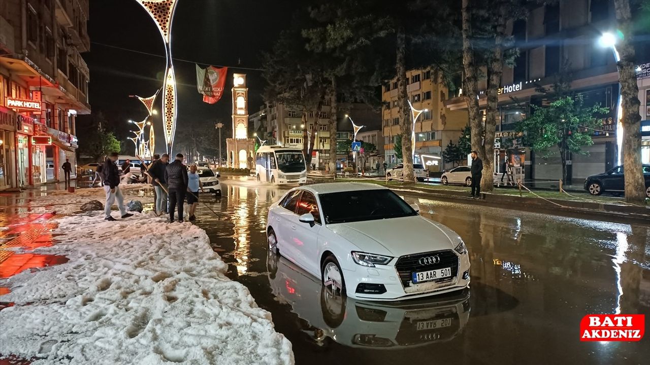 BİTLİS (AA) - Bitlis'in Tatvan ilçesinde sağanak ve dolu, hayatı olumsuz etkiledi. İlçede aralıklarla devam eden sağanağın ardından akşam saatlerinde dolu etkili oldu. Cumhuriyet Caddesi'nin bazı bölgelerinde sağanak ve dolu nedeniyle oluşan su birikintileri ulaşımda aksamalara yol açtı. Vatandaşlar, yağıştan korunmak için saçakların altına ve iş yerlerine sığındı. Yağış nedeniyle sürücülerin ilerlemekte zorlandığı ilçede, bazı iş yerlerini su bastı. İş yeri sahipleri, suyu tahliye etmek için çalışmalara başladı. Tatvan Belediye Başkanı Mümin Erol, 10 iş makinesi ve 55 personelle cadde ve sokaklarda biriken suyu tahliye etme ve tıkanan mazgalları açma çalışmalarını yürüttüklerini belirtti.