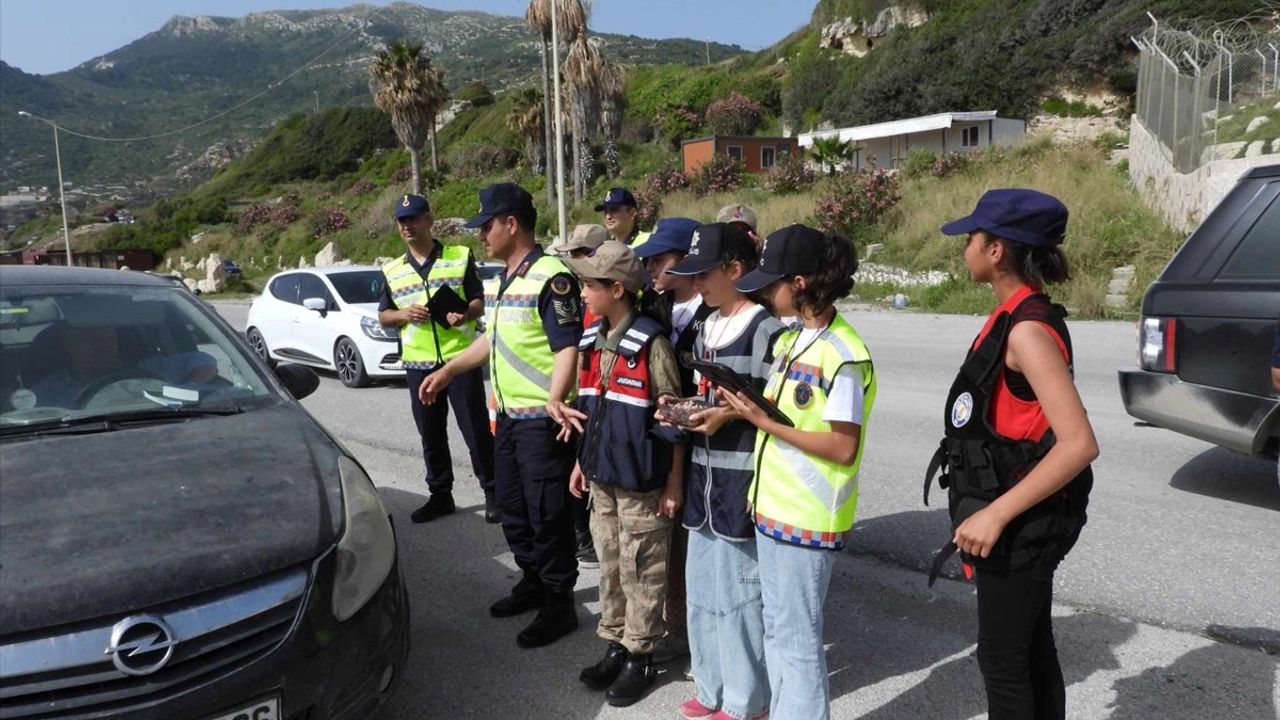 Ellerine tablet ve uyarı levhalarını alan çocuklar, durdurulan sürücülerin evraklarını kontrol etti.