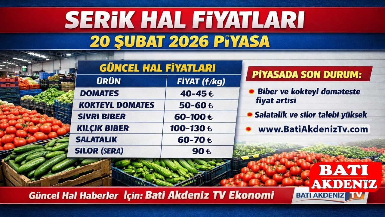 Antalya’nın önemli tarım merkezlerinden Serik’te 20 Şubat 2026 tarihli hal fiyatları açıklandı. Domates, biber ve salatalık başta olmak üzere sebze grubunda arz-talep dengesine bağlı olarak fiyat hareketliliği yaşandı.