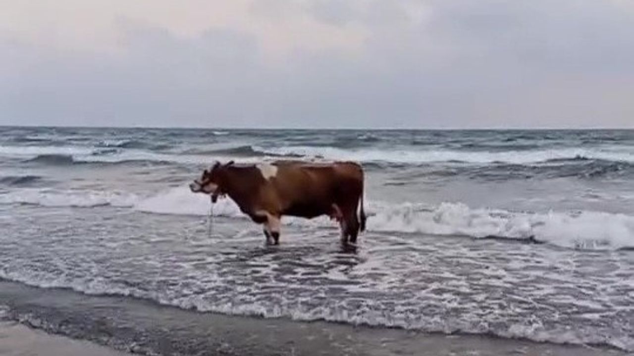 Hatay’da etkisini artıran kavurucu sıcaklar hayvanları da zor durumda bırakıyor. İlginç olay Samandağ sahilinde yaşandı. Aşırı sıcaktan bunalan bir inek, serinlemek için sahile inerek denize girdi.