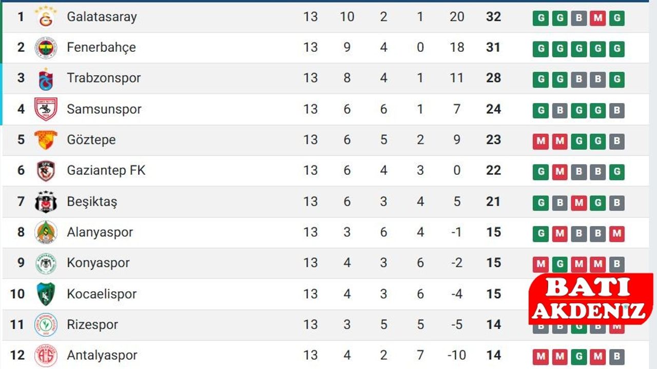 2025/26 sezonunda Süper Lig’de 13. haftalar itibariyle puan durumu ve fikstür bilgileri güncellendi. Galatasaray 32 puanla lider durumda. Fenerbahçe 31, Trabzonspor 28 puanla onu izliyor.