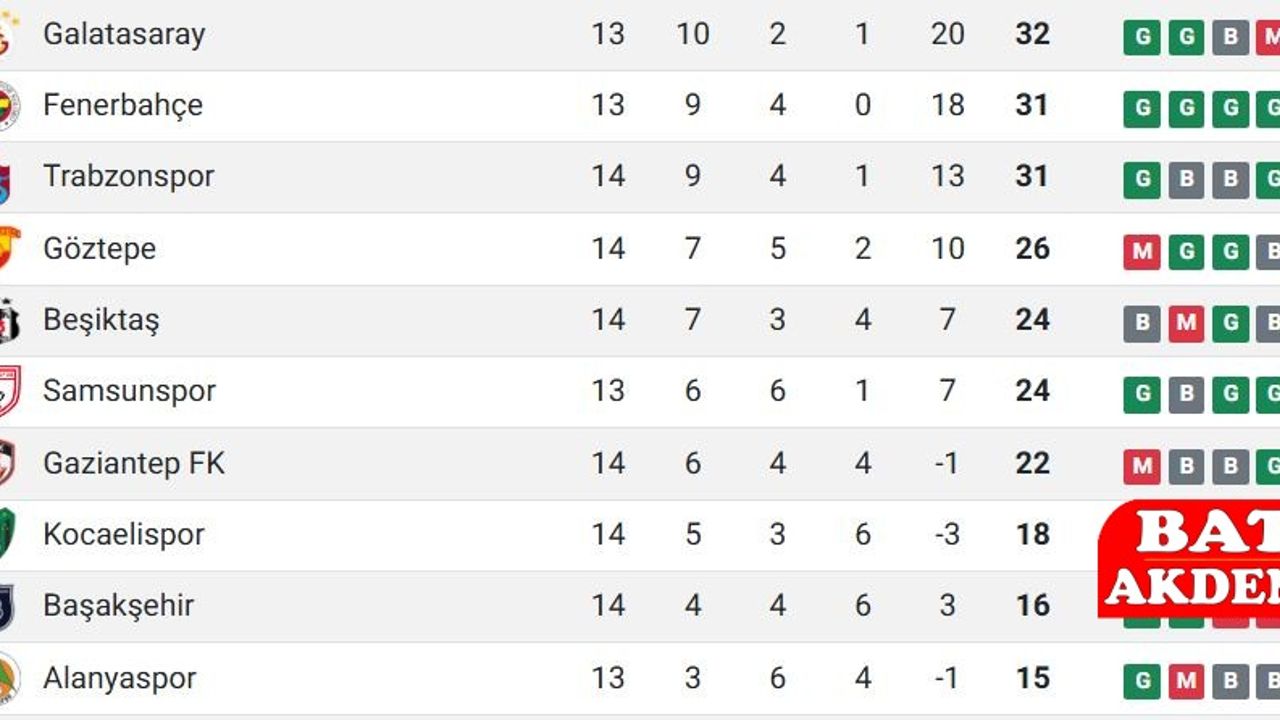Galatasaray, oynadığı 13 maçta 10 galibiyet, 2 beraberlik ve 1 mağlubiyet alarak 32 puanla liderliğini sürdürdü. Sarı-kırmızılıları, 13 maçta yenilgi yüzü görmeyen Fenerbahçe takip ediyor. 9 galibiyet ve 4 beraberlik alan sarı-lacivertliler 31 puanla ikinci sırada.