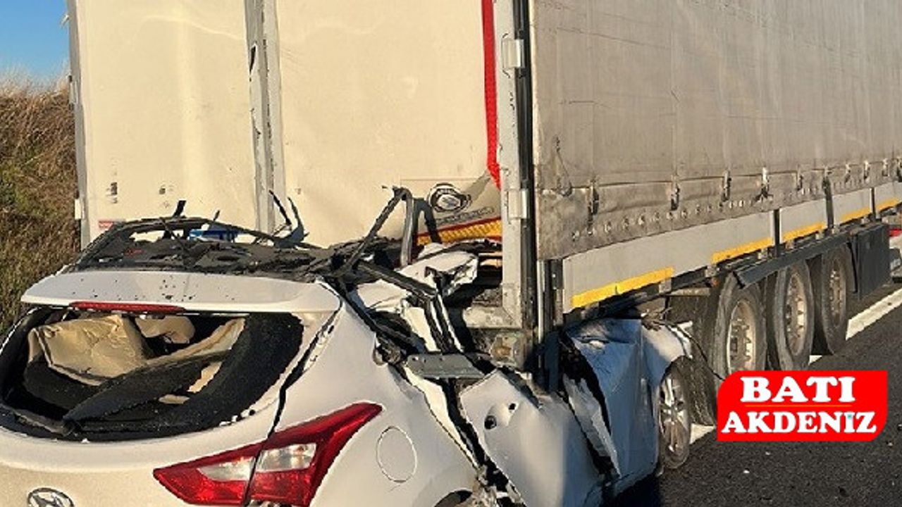 Edirne yönünde ilerleyen bir otomobil, aynı istikametteki TIR’ın dorsesine arkadan çarptı ve otomobil TIR’ın altına girerek hurdaya döndü.