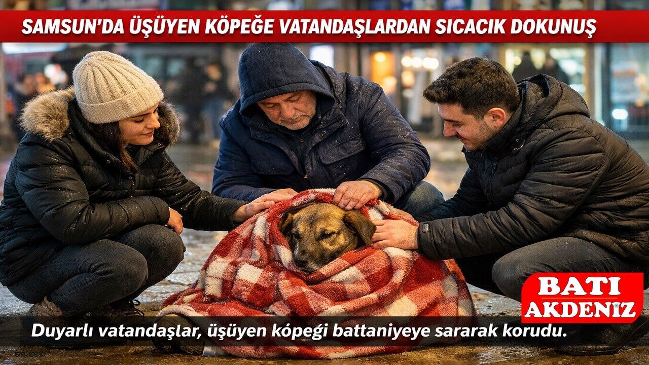 Samsun’da etkili olan soğuk hava, sokak hayvanlarını da olumsuz etkiliyor. Kent merkezinde üşüdüğü fark edilen bir sokak köpeği, çevredeki vatandaşların dikkatini çekti. Duyarlı vatandaşlar, köpeğin daha fazla üşümemesi için battaniye temin ederek hayvanı sardı.
