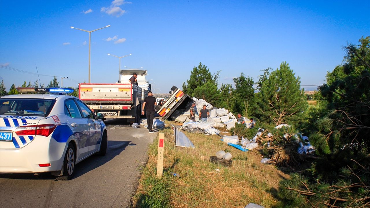 UŞAK (AA) - Uşak'ta şarampole devrilen iplik yüklü tırın sürücüsü yaralandı.