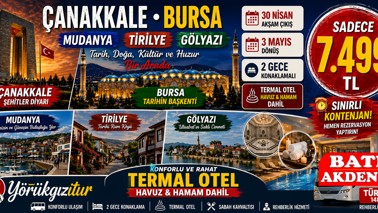 Özellikle Çanakkale, Bursa, Mudanya, Tirilye ve Gölyazı rotasını kapsayan özel tur programı; tarih, doğa ve kültürü bir arada yaşamak isteyenler için eşsiz bir fırsat sunuyor. Şehitler diyarı Çanakkale’nin manevi atmosferinden, Osmanlı’nın ilk başkenti Bursa’nın tarihi dokusuna; Mudanya’nın sahil güzelliğinden Tirilye’nin nostaljik sokaklarına ve Gölyazı’nın huzur veren manzarasına kadar uzanan bu yolculuk, katılımcılara dolu dolu bir gezi vadediyor.